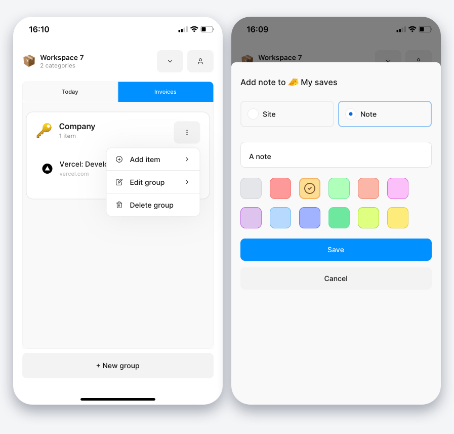 • Save site and note - When you click save, you will see your library of workspaces and categories. You can then choose to save to an existing group or create a new group.